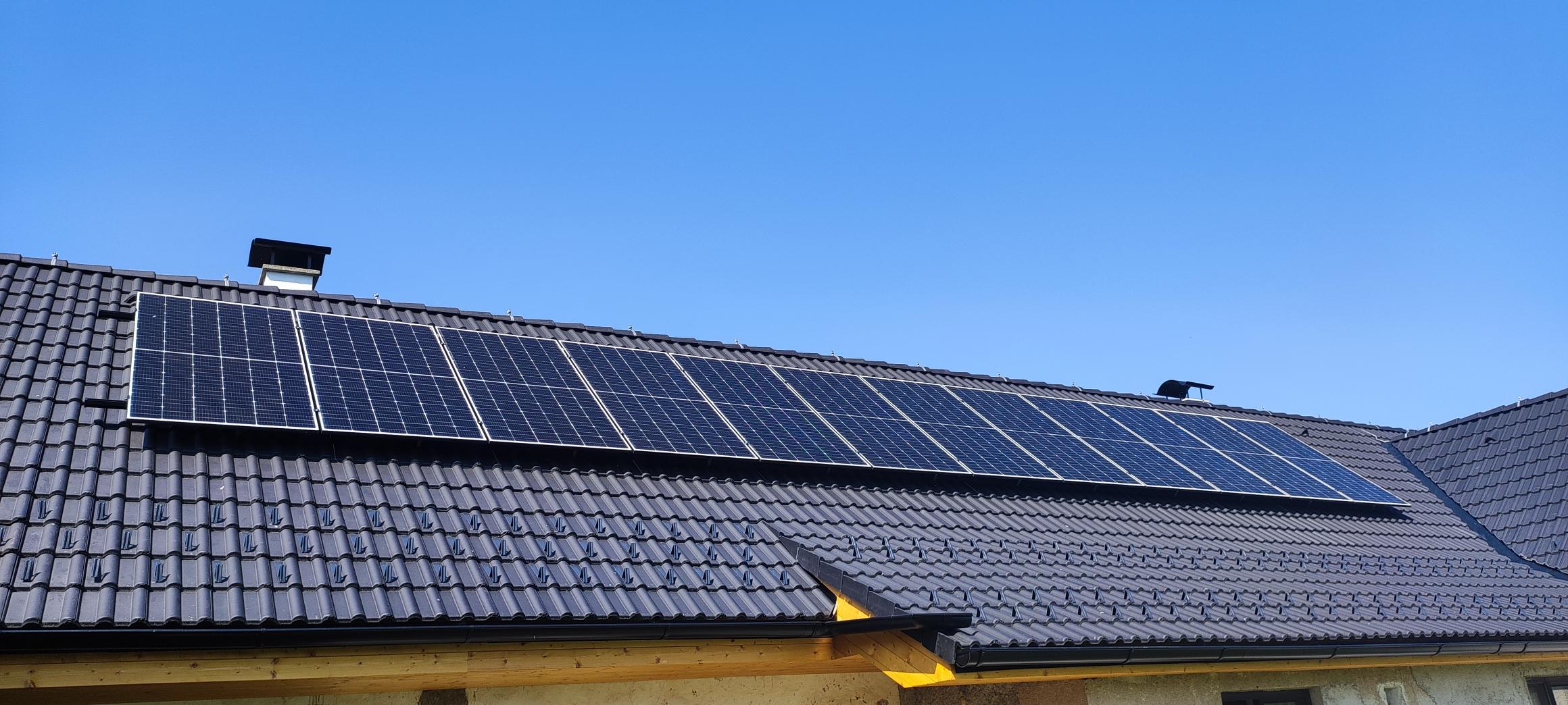 Střecha s 12 panely DAH Solar 550Wp, 6,6kWp celkový výkon, střídač GOODWE 10kW.
